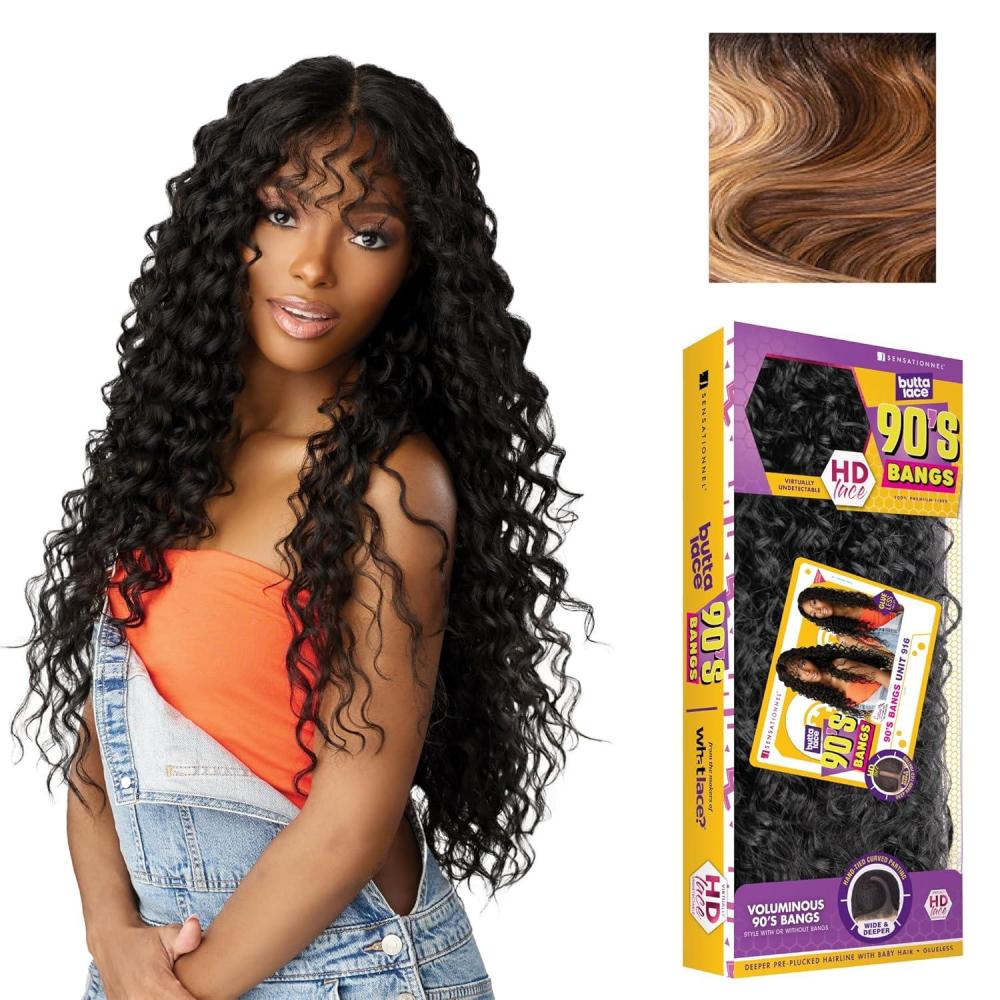 Sensationnel Butta Lace 90Sbangs Wigs – Unit 916 Glueless Wide Deep Center Part Synthetic Preplucked Hairline (1 JETBLACK)(BALAYAGECHOCOLATE)