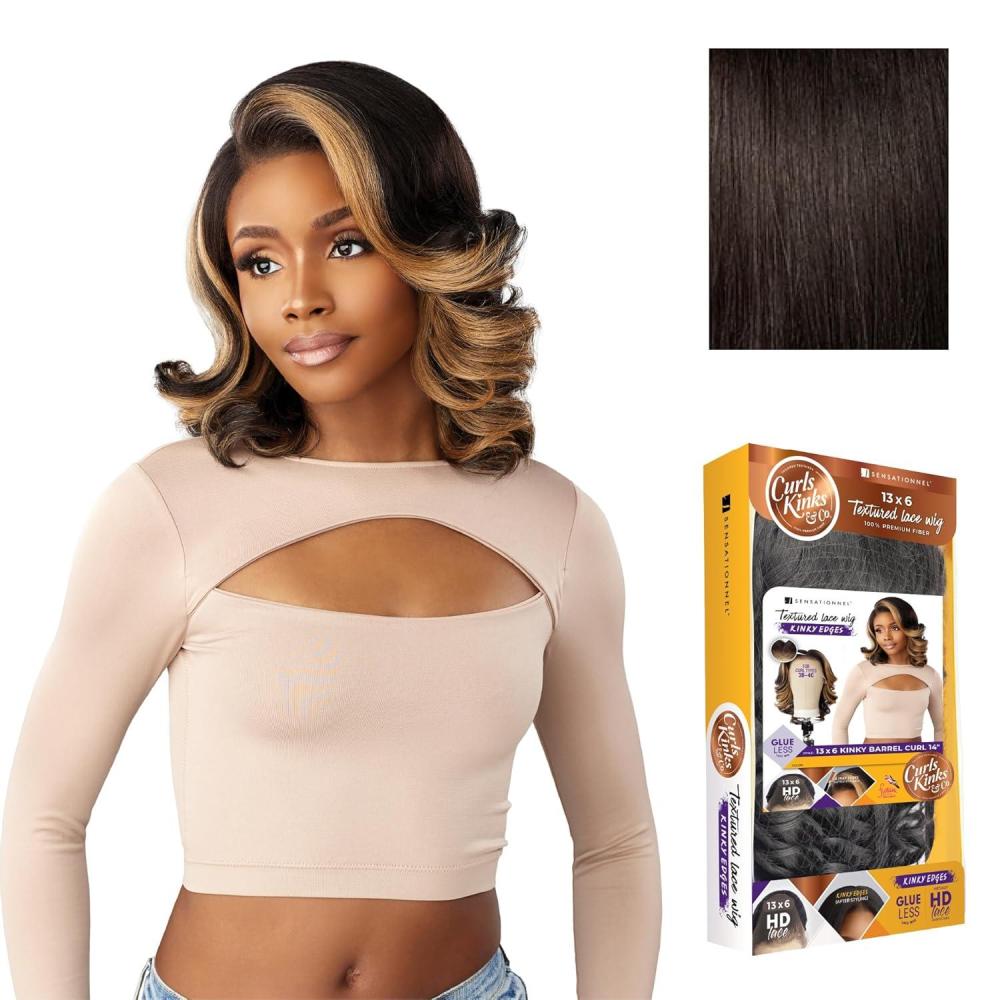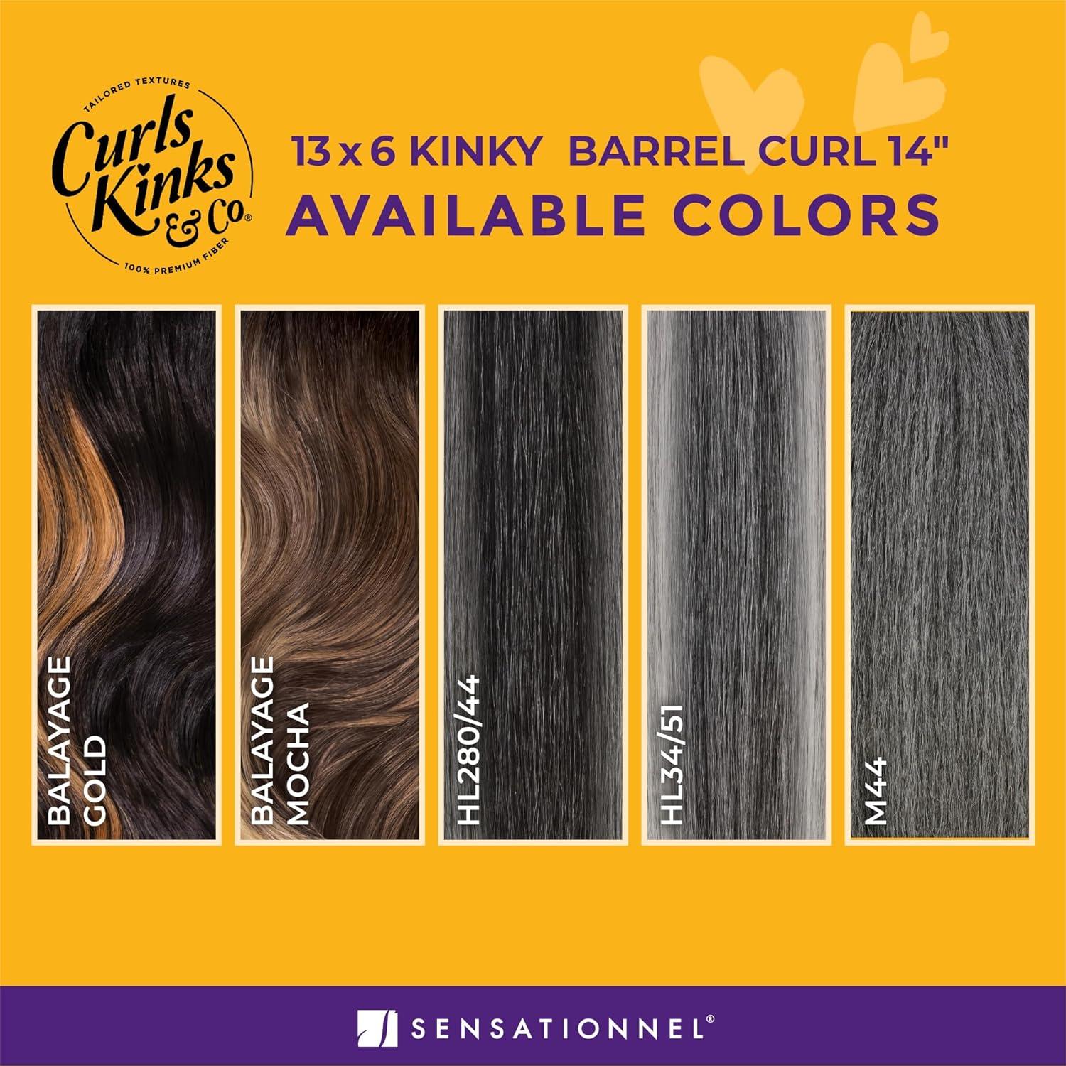 Sensationnel Curls Kinksandco Kinkyedges Wig – Kinky Barrel Curl 14 Inch 13X6 Lace Frontal Natural Kinkytexture Edged Hairline for Natural 3C to 4C Hair Textures (1 JETBLACK)(BALAYAGEGOLD)