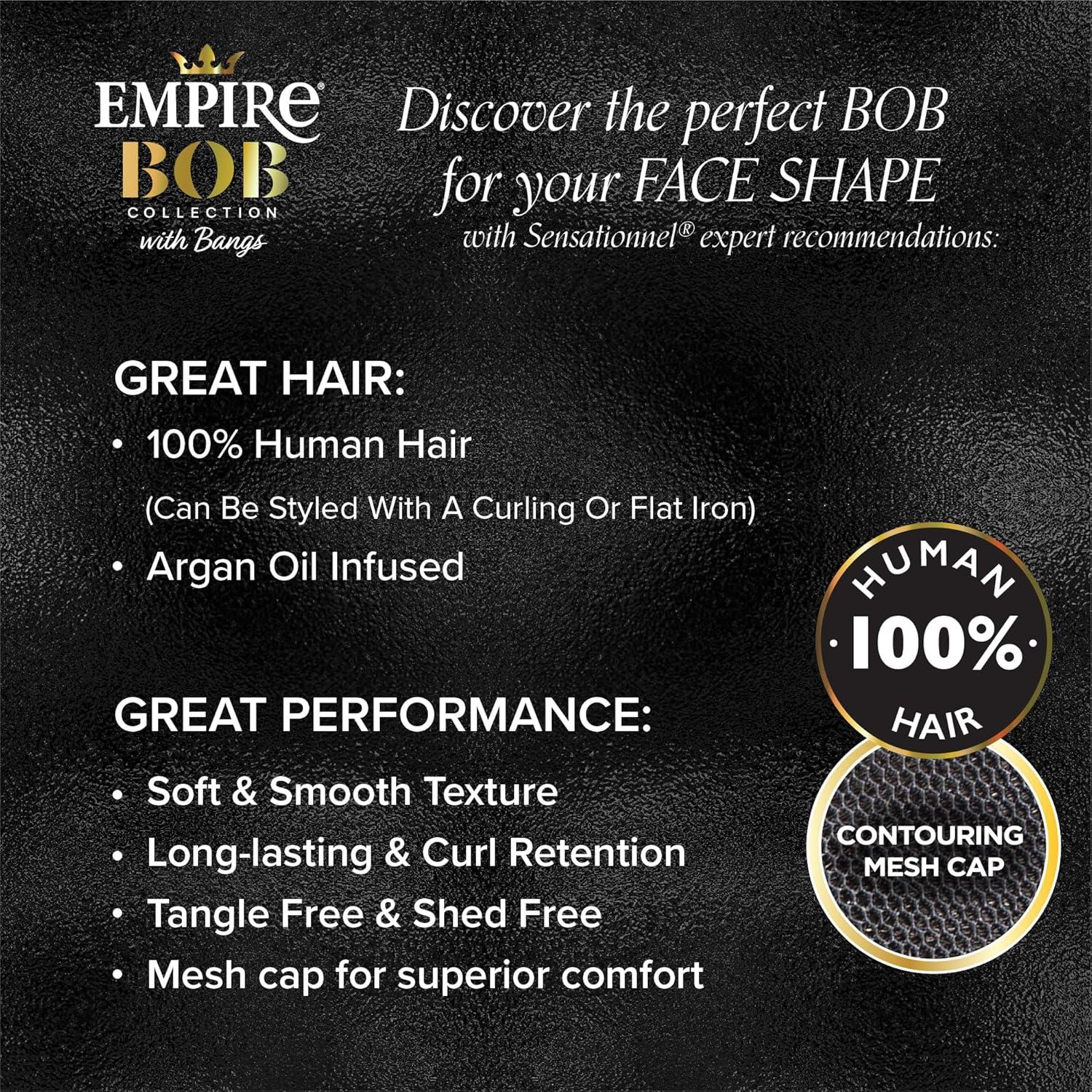 Empire Bob Collection humanhair wigs with bangs by Sensationnel use the original flagship weaving Empire human hair. The curls last a long time and the mesh cap provides extra comfort. Quick on the go pre styled wigs offer a fast human hair wig for everyday wear.