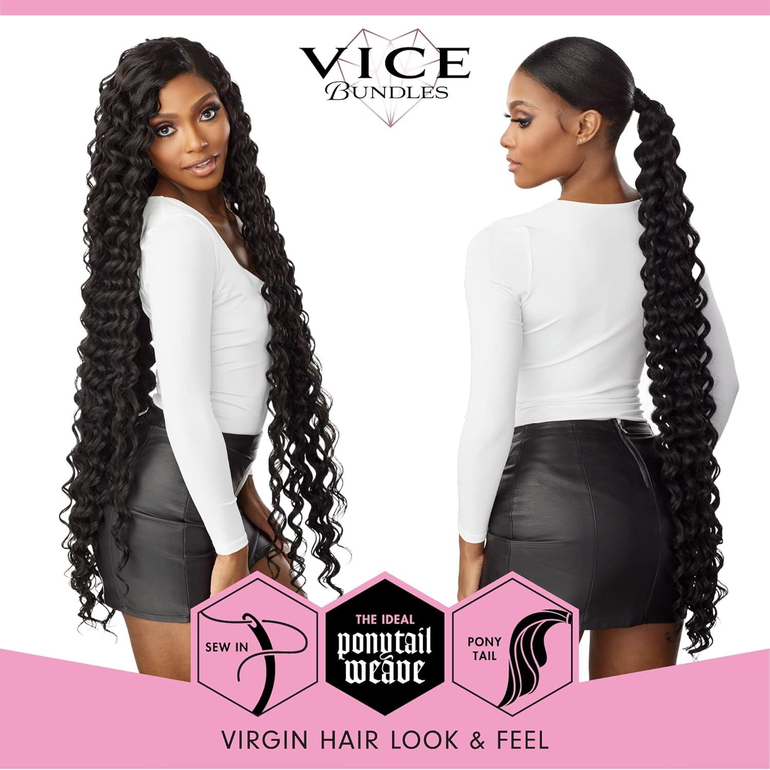 Vice Bundle hair by Sensationnel is a synthetic fiber virgin hair dupe weave and pony tail. It's the virgin hair likeness texture that is great for sew-in hairstyles and ideal for ponytails. Vice Bundle is available in four affordable styles-body wave, crimp, deep, and straight, Deep twist, Boho curl styles and comes in a variety of long lengths 24, 30, and 36 inches. Vice Bundle is available in basic and solid colors and is used for sew-in quick weave ponytail pony wrap hair styles.