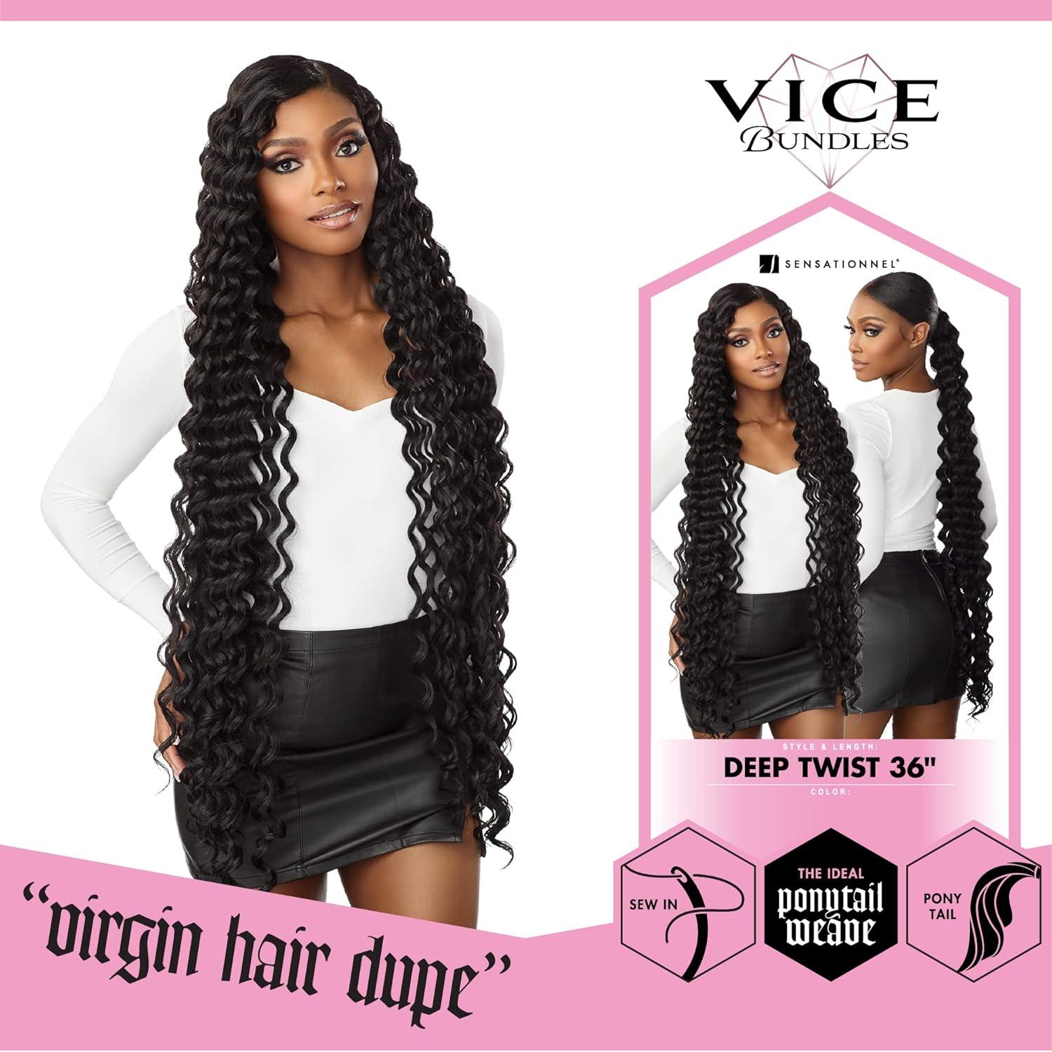 Vice Bundle hair by Sensationnel is a synthetic fiber virgin hair dupe weave and pony tail. It's the virgin hair likeness texture that is great for sew-in hairstyles and ideal for ponytails. Vice Bundle is available in four affordable styles-body wave, crimp, deep, and straight, Deep twist, Boho curl styles and comes in a variety of long lengths 24, 30, and 36 inches. Vice Bundle is available in basic and solid colors and is used for sew-in quick weave ponytail pony wrap hair styles.
